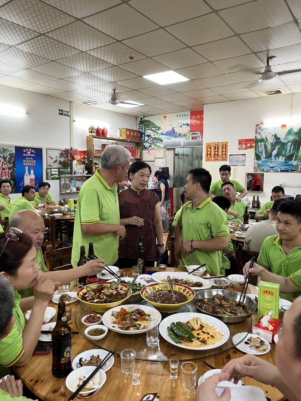 傍晚時分,生產(chǎn)部的同事們齊聚一堂。飯桌上擺滿了各色美味:鮮嫩可口的黃魚,水煮牛肉油亮誘人,時令蔬菜青翠欲滴。