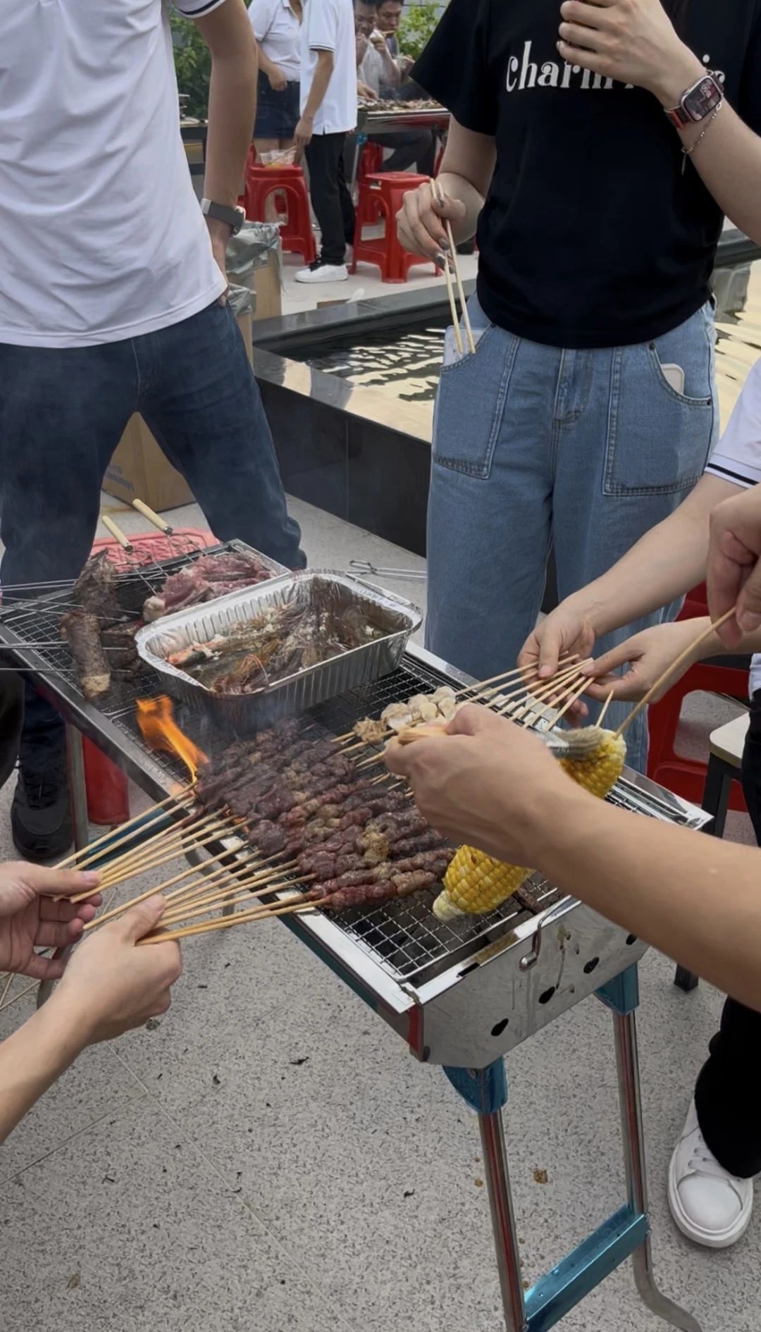 夜風(fēng)輕拂,遠處城市的燈火與頭頂?shù)男枪饨幌噍x映,為這場燒烤派對增添了別樣的浪漫。
