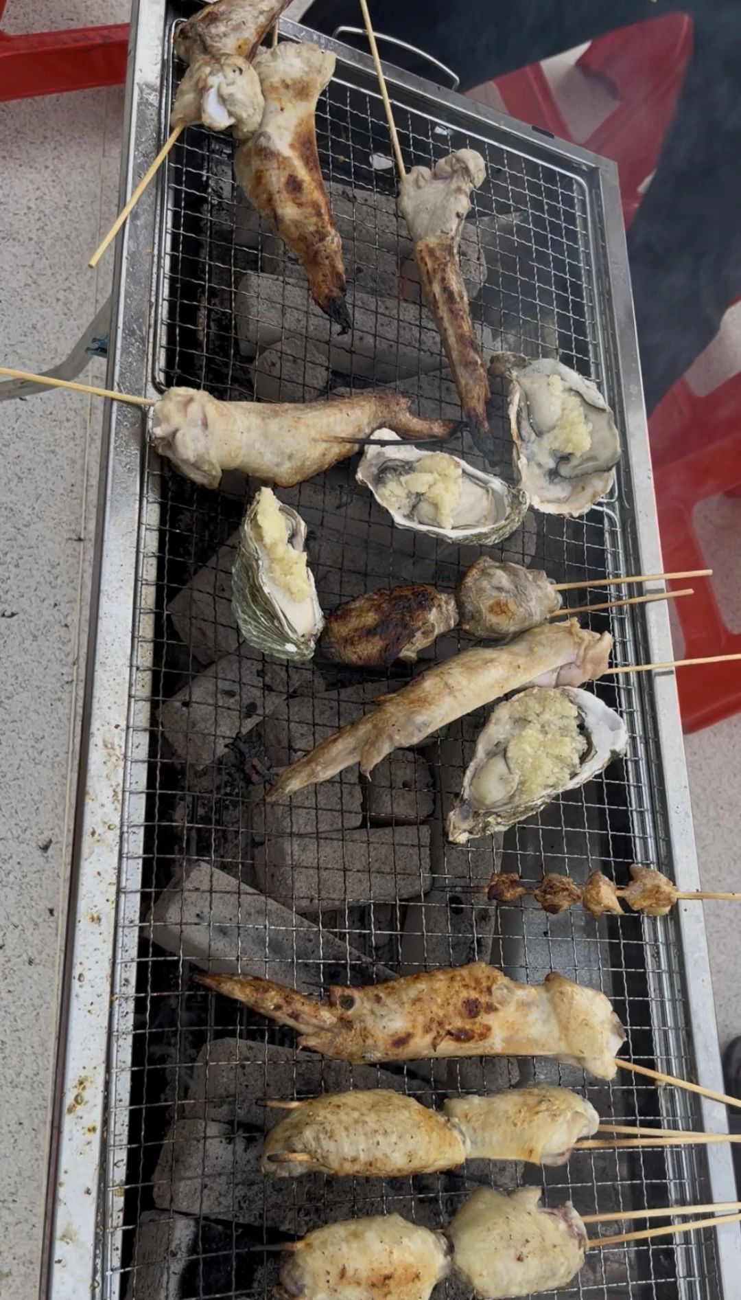 燒烤架上的炭火噼啪作響,新鮮的肉串、海鮮在鐵網(wǎng)上滋滋冒油,香氣隨著晚風(fēng)飄散開來。